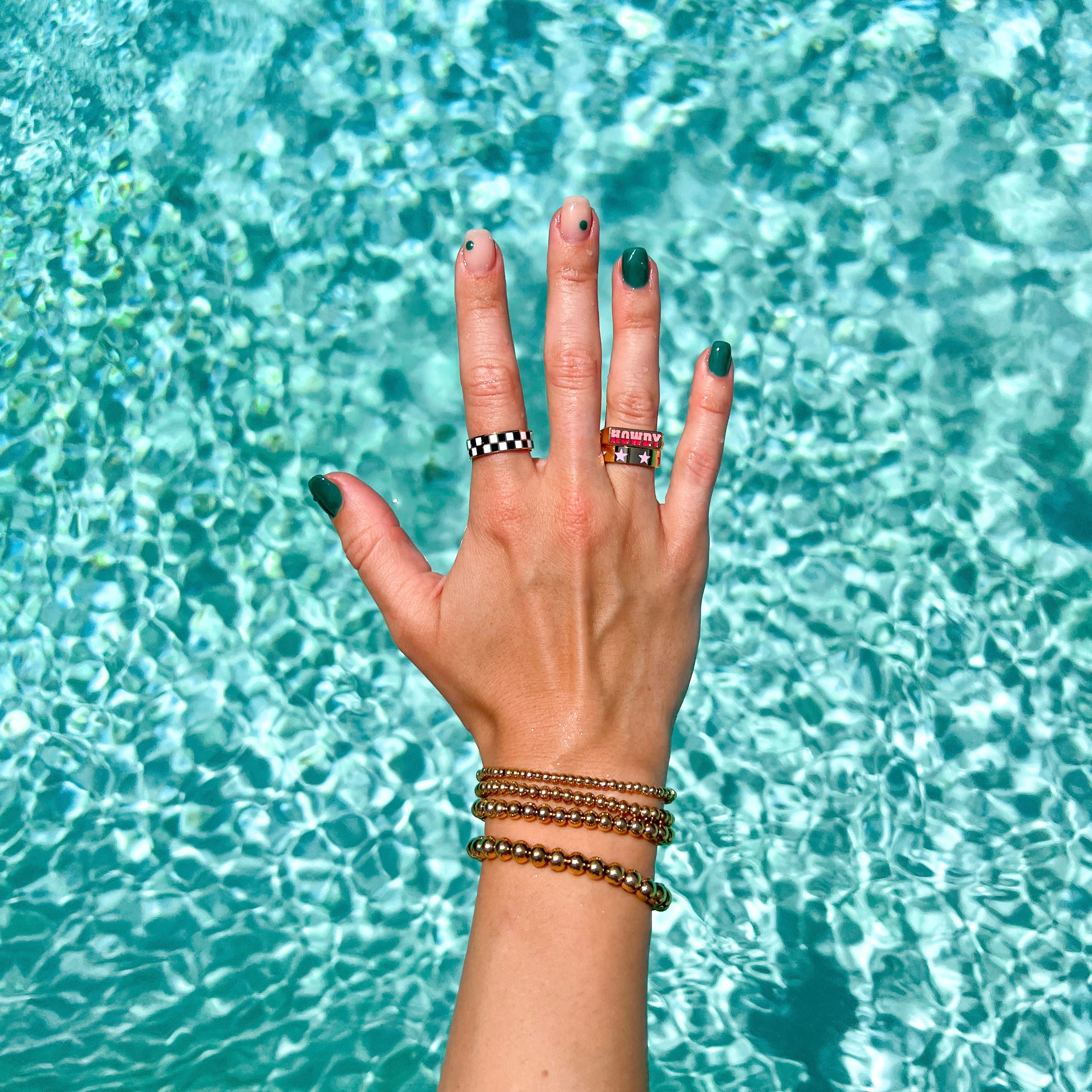 Our water-resistant jewelry is very durable and low maintanence. We just recommend rinsing with freshwater and patting dry after exposure to salt water to keep your pieces lasting as long as possible! See our Jewelry Care page for more details!
