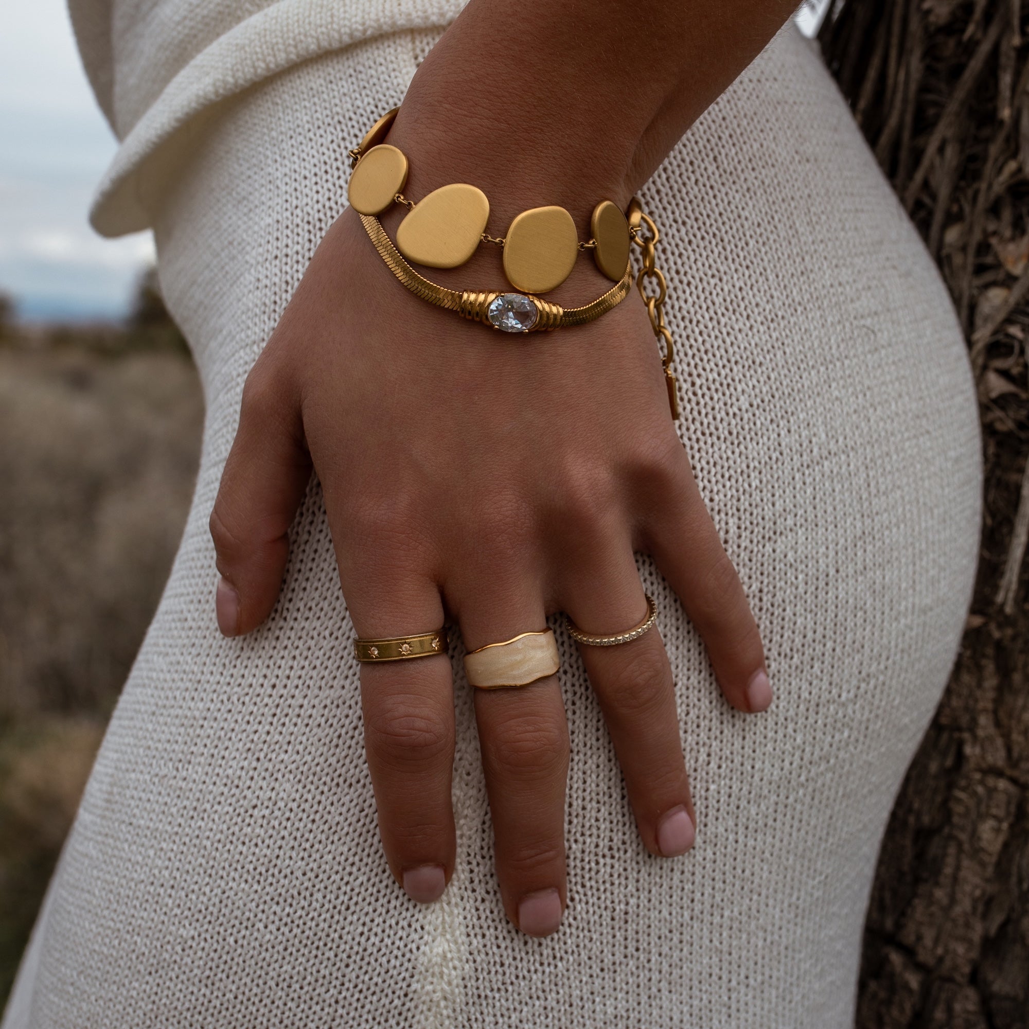 Our water resistant pieces are made from a base metal of 316L marine grade stainless steel — which makes them naturally durable against oxidation. Our gold pieces are coated in 18K gold using PVD — Physical Vapor Deposition. To learn more about it, check out this blog post!