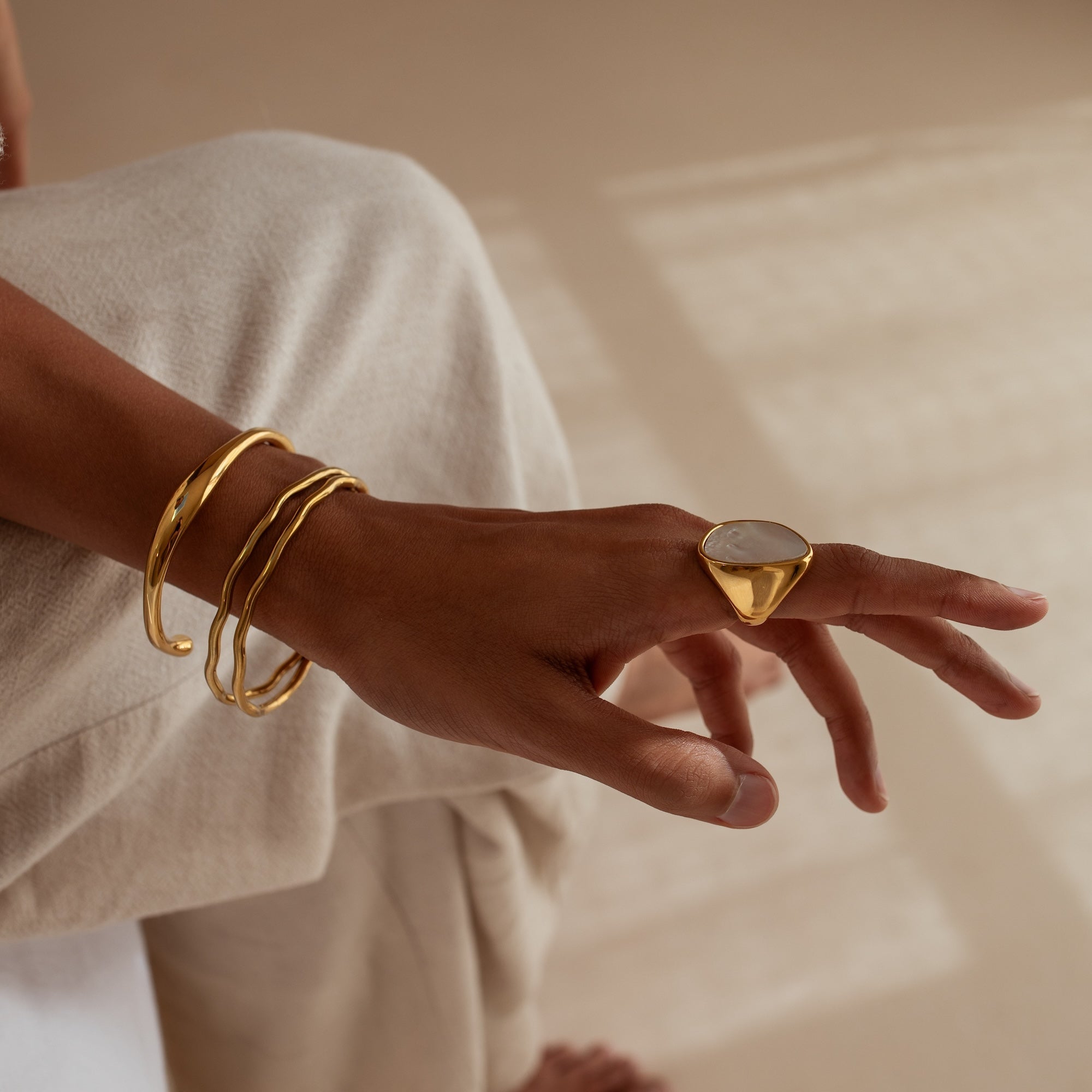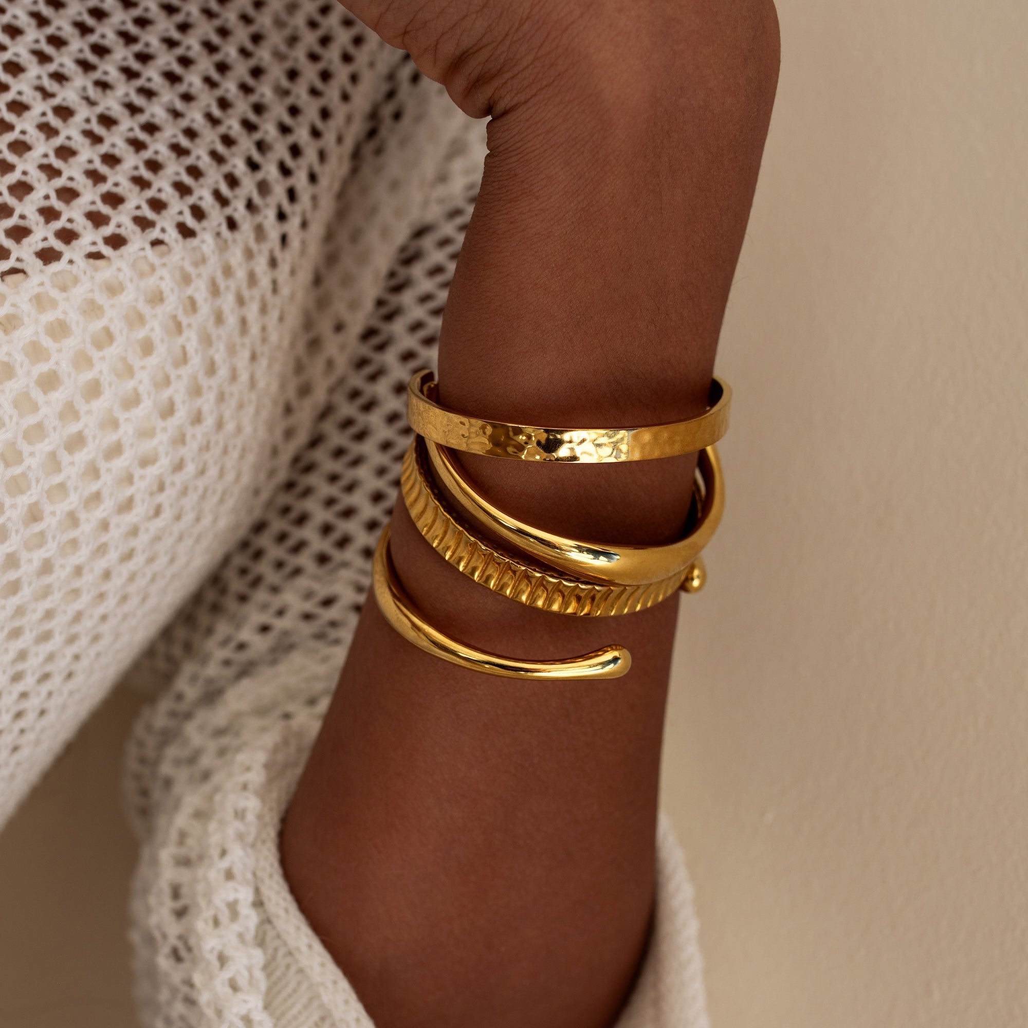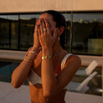 Our water resistant pieces are made from a base metal of 316L marine grade stainless steel — which makes them naturally durable against oxidation. Our gold pieces are coated in 18K gold using PVD — Physical Vapor Deposition. To learn more about it, check out this blog post!