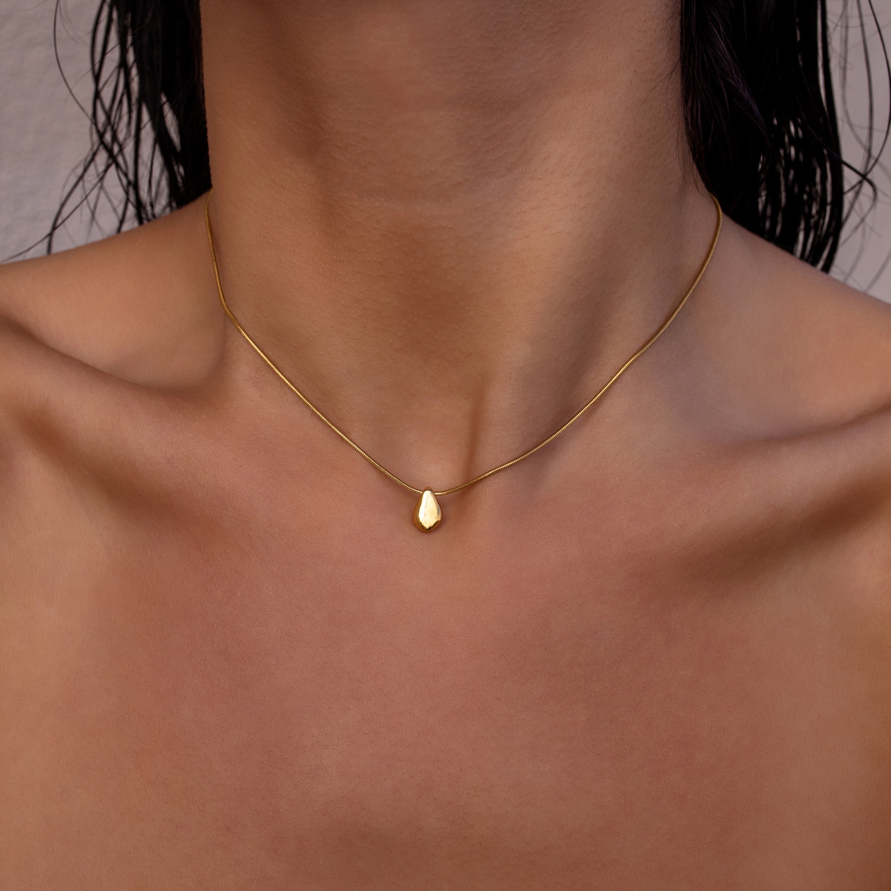 The Form Necklace is a small pendant necklace featuring a softly sculpted gold form that rests close to the collarbone, creating subtle structure and warmth. An organic shaped pendant necklace refined on its own and thoughtfully paired with the Form Cuff and Form Studs for a cohesive finish. Water resistant, hypoallergenic, and tarnish resistant.