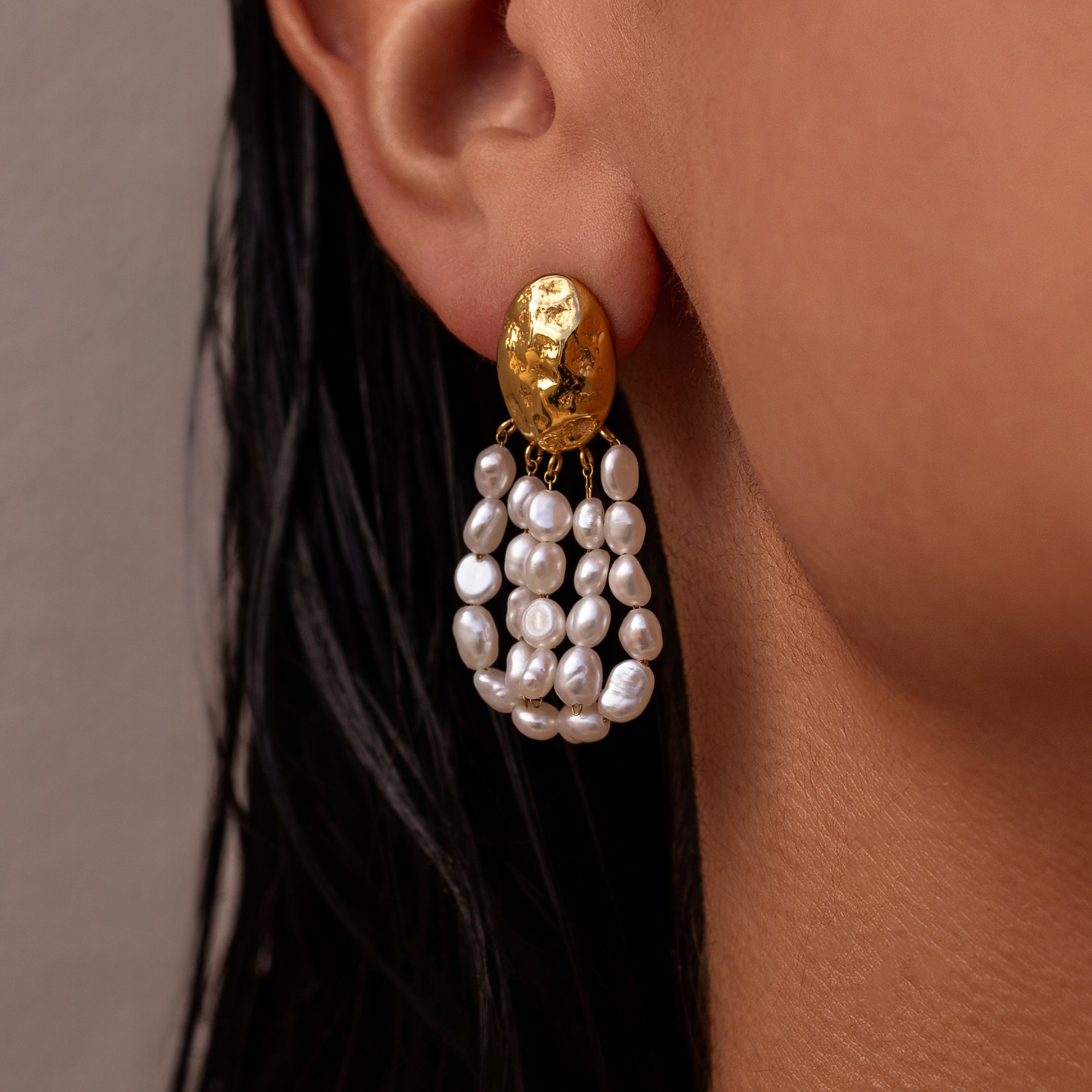 Gently hammered gold form meets cascading freshwater pearls, designed to move gently and catch light with ease.