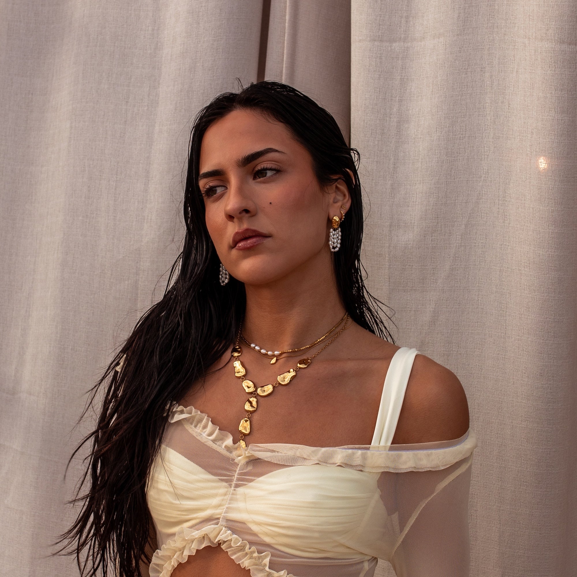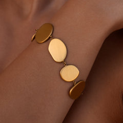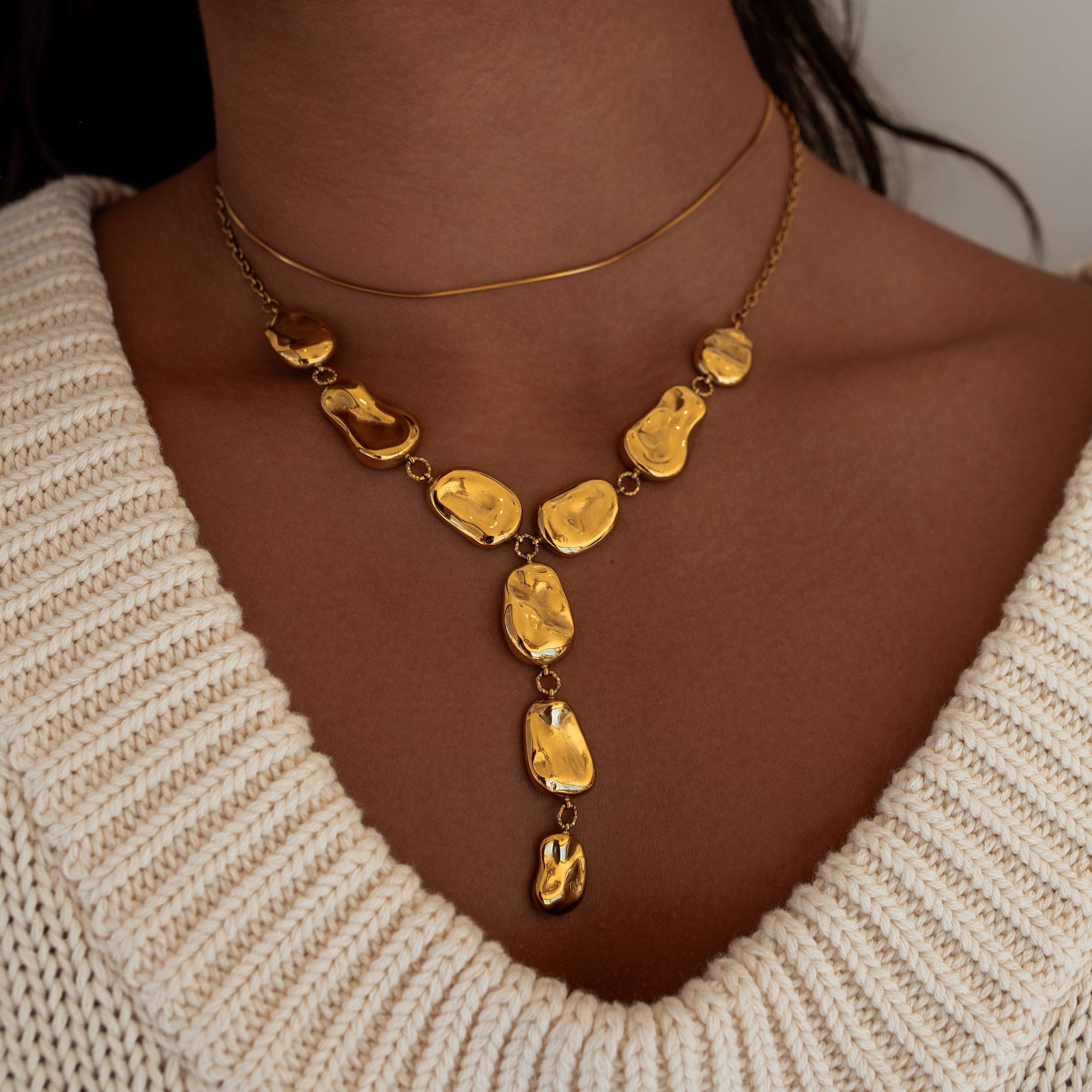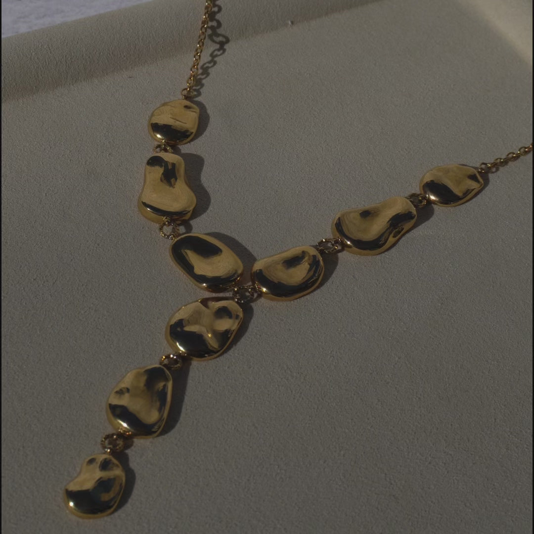 The Origin Necklace brings sculpted gold discs together through softly hammered connection rings, creating natural texture, movement, and balance. This statement gold Y necklace is intentionally formed to feel organic and lived in, with hammered rings that create subtle dimension at every angle. A unique gold Y necklace designed to layer or stand on its own, and pairs effortlessly with the Origin Bracelet. Water resistant, tarnish resistant, and hypoallergenic.